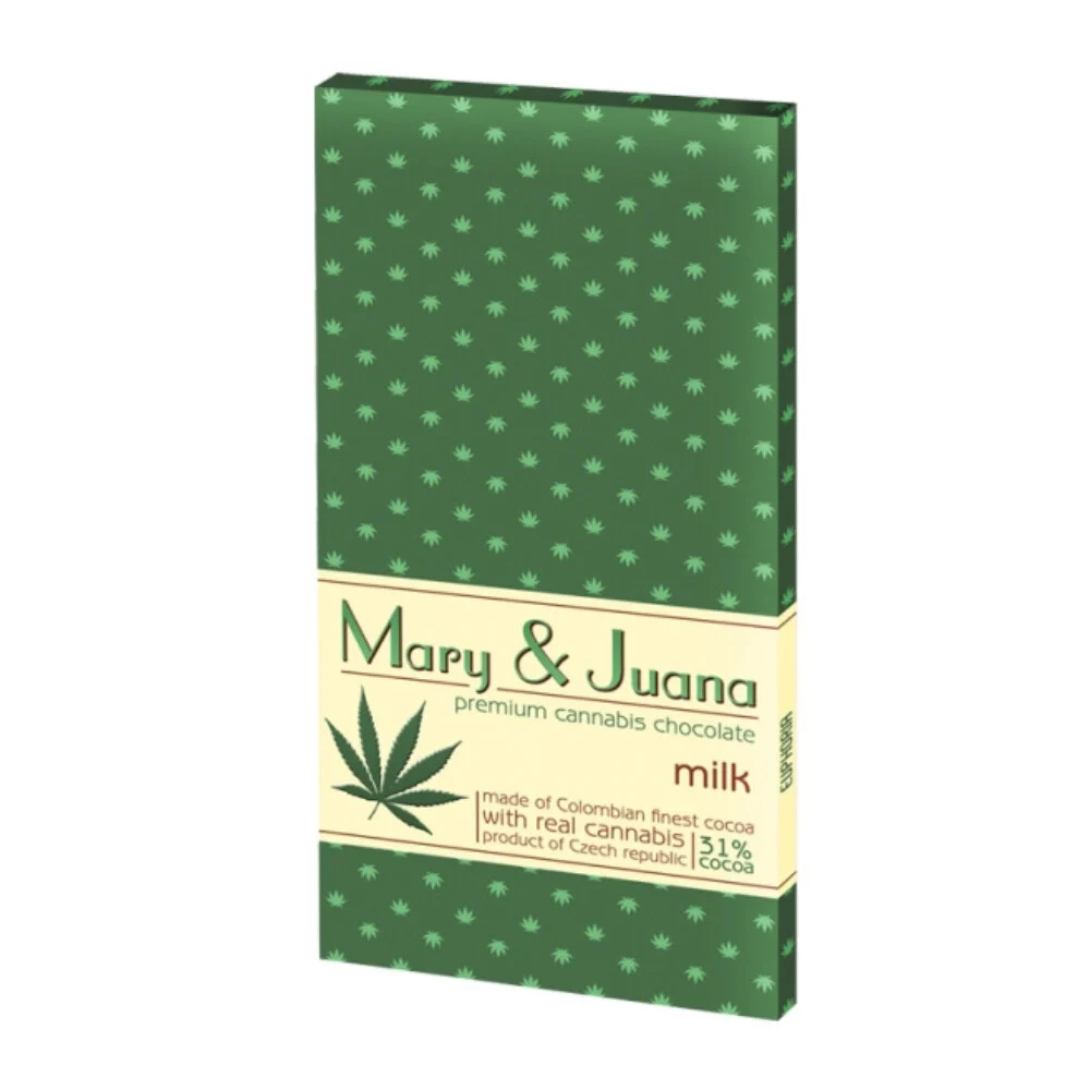 Mary & Juana prémium kendercsokoládé tejízű, 10% kendermaggal, válogatott legfinomabb kakaóból (31% kakaótartalom).