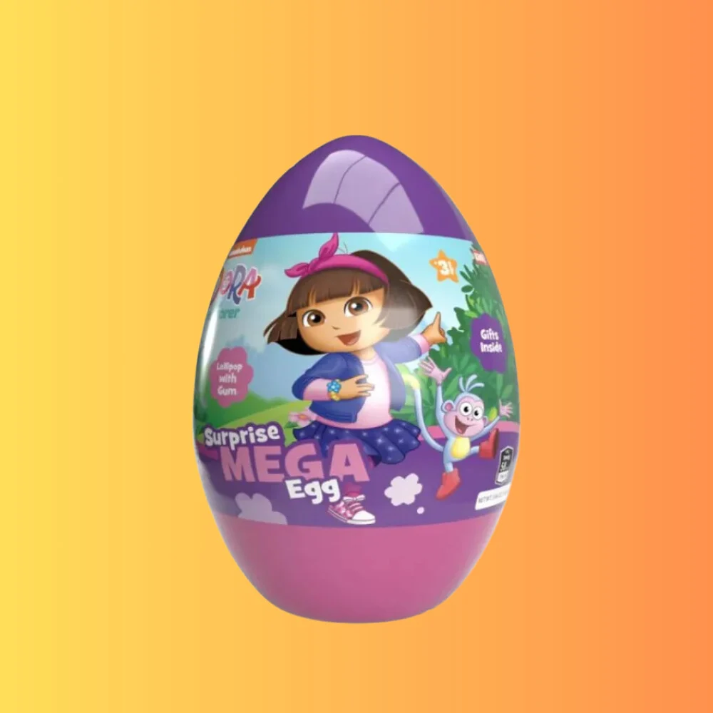A Mega Surprise Egg-Óriás Meglepetés Tojás Persely 160g I Dóra A Felfedező egy szórakoztató ajándék, amely a népszerű Dóra A Felfedező karakterével van díszítve. Az óriás tojás tartalmaz egy finom édességet és egy meglepetést, miközben a tojás formájában lévő persely segít megtakarítani. Tökéletes választás a Dóra rajongóinak!