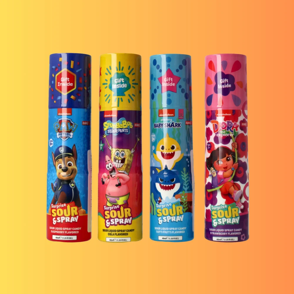 Ez a 40 ml-es savanyú fecskendő egy igazán különleges édességélményt kínál, hiszen a gyerekek kedvenc karakterei, mint Mancs Őrjárat, Baby Shark, Spongyabob és Dóra, kísérik őket az ízletes felfedezésre. A spray formájában kínált savanyú íz intenzív, frissítő, és tökéletes szórakozást nyújt a kicsiknek.