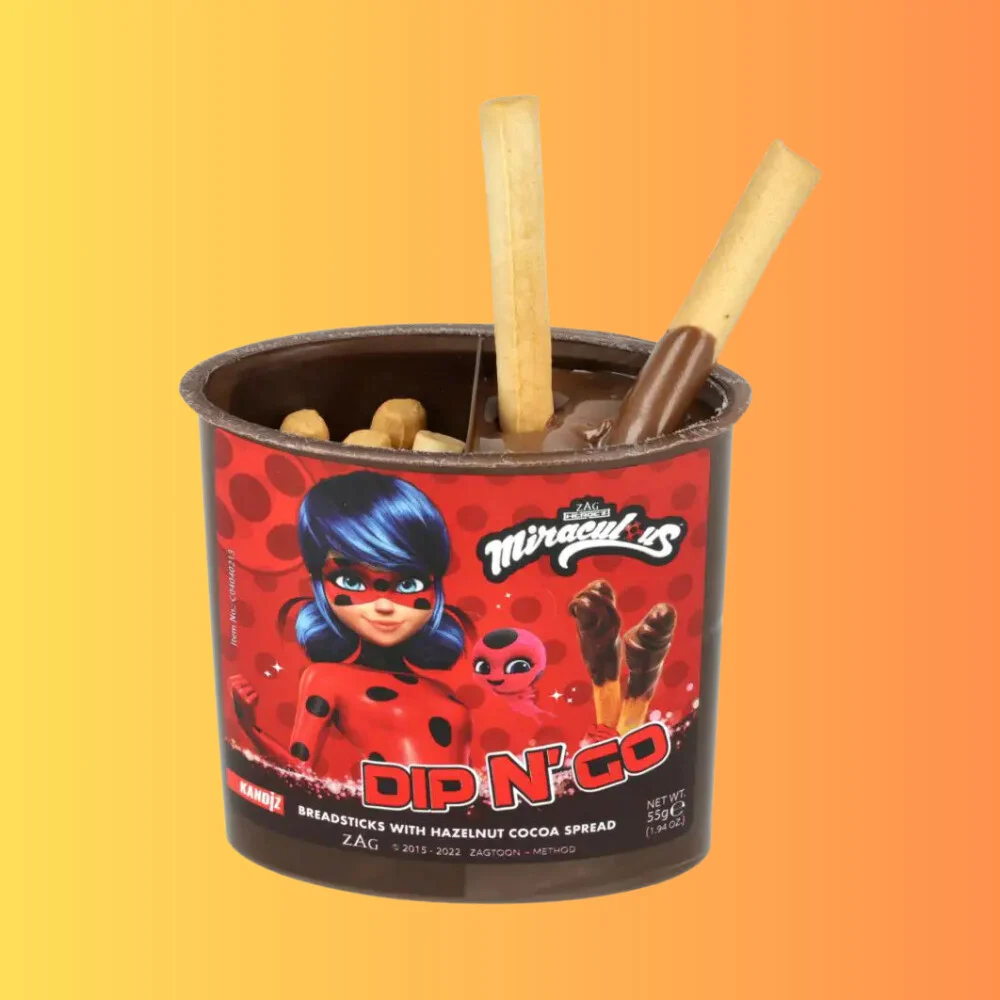 A Ladybug Dip N’ Go kakaós mogyorókrémmel töltött ropogós pálcikái egy ínycsiklandó snack, amely egyszerre nyújt krémes és ropogós élményt. Tökéletes nassolnivaló bárhol, bármikor.