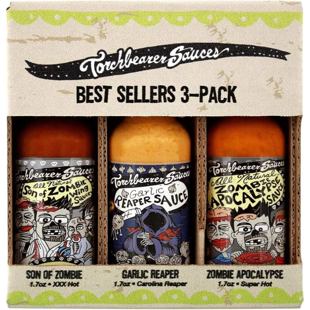 Az ultimátum ajándék készlet minden forró szósz szerelmese számára, amely kiváló minőségű, kivonatmentes szószokat kínál, mindennemű természetes összetevőkkel. Tartalmazza a Hot Ones első 3 Torchbearer szószát: Zombi Apokalipszis, Fokhagyma Reaper, és a Zombi Fia. A Zombi Apokalipszis szellem paprikákat és habanerokat kever fűszerekkel, zöldségekkel, ecettel és olajjal, így teremtve meg ezt az édes, mégis ijesztően csípős szószt. A Fokhagyma Reaper lassú égést kínál, melyet a fokhagyma és citrusjegyek visznek át finom, krémes textúrával. A Zombi Fia pedig Chipotle BBQ-t, Mézes Fokhagymát és mindenki kedvencét, a Zombi Apokalipszist kombinálja. Kiváló választás pizzákhoz, grillezett húsokhoz, tofuhoz, szendvicsekhez és marinádokhoz.