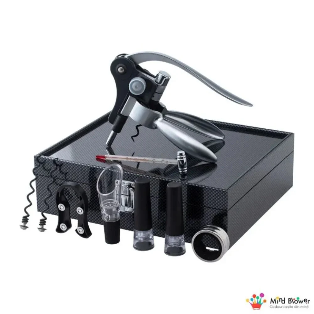 - 9 bor kiegészítő (borzáró, vákuumszivattyú, fólia vágó, aerátor, csepegtető és csepegtető elleni gyűrű, nyitó, dugóhúzó)